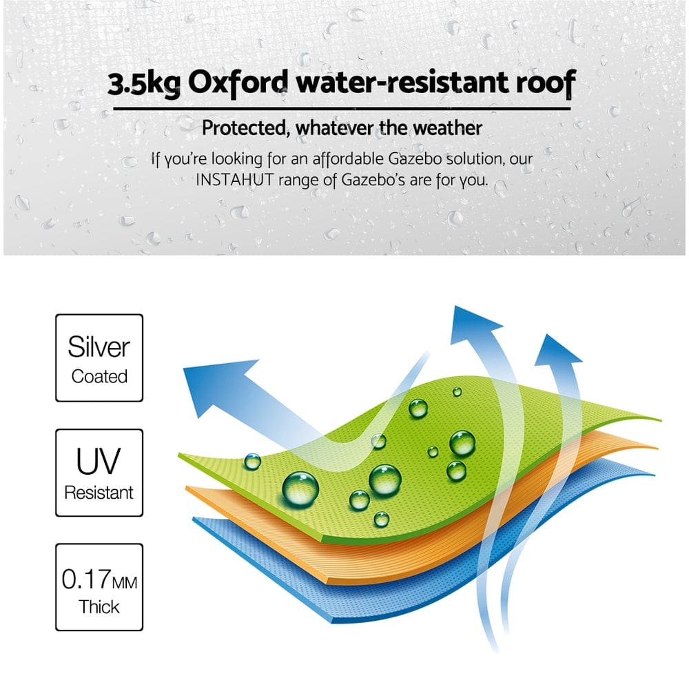 Featuring high-density, long-lasting Silver coated oxford fabric with effective UV and water-repellent treatments, this INSTAHUT 3X3 Pop-Up Gazebo provides a lovely ground and canopy coverage of 300 x 300cm.